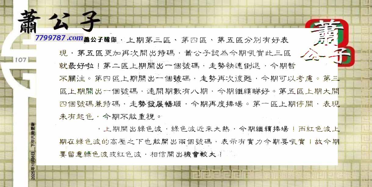 107期:六合皇金句/老总论码/萧公子/林大师/五行夺码/老总信箱截
