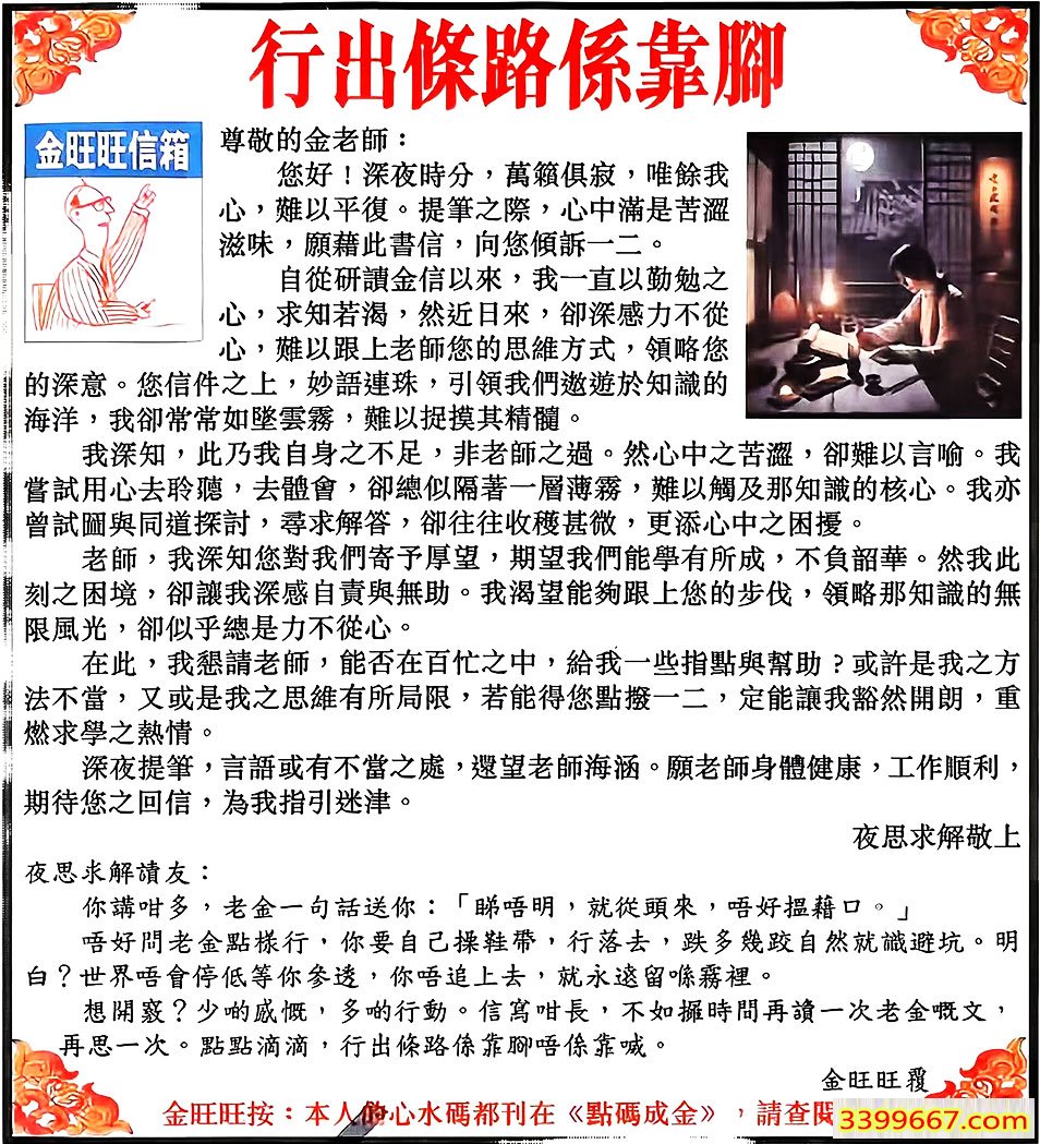 | 主题 :110期:金旺旺信箱彩民推荐→→《行出條路係靠腳》 |