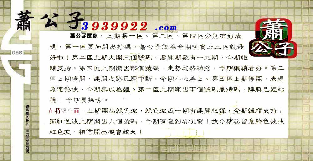 | 主题 :068期:六合皇金句/老总论码/萧公子/林大师/五行夺码/老总信箱截 |