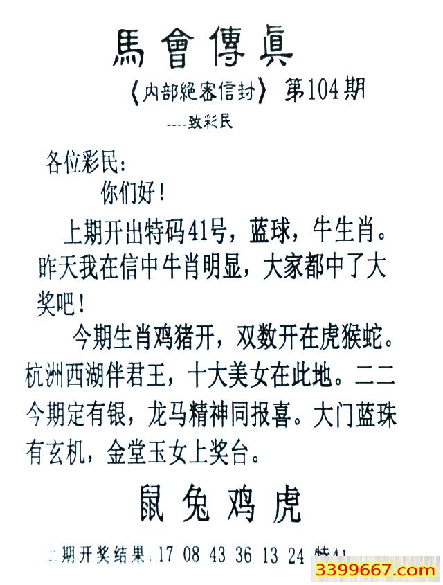 104期:首发推荐:≮馬會傳眞≯→(香港正版)