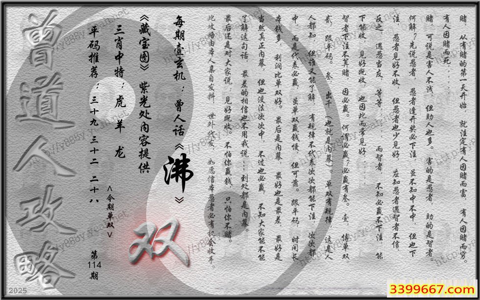 主题 :114期藏寶圖 新:不驾蒲轮左禹汤 老:闲上山来看野水 禁:狗 禁:9尾
