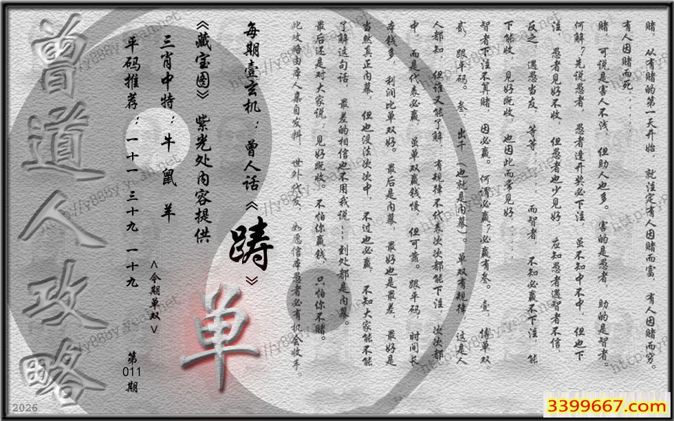 | 主题 :011期藏寶圖 新:因想后湖题柱处 老:汉城黄柳映新帘 禁:虎 禁:4尾 |