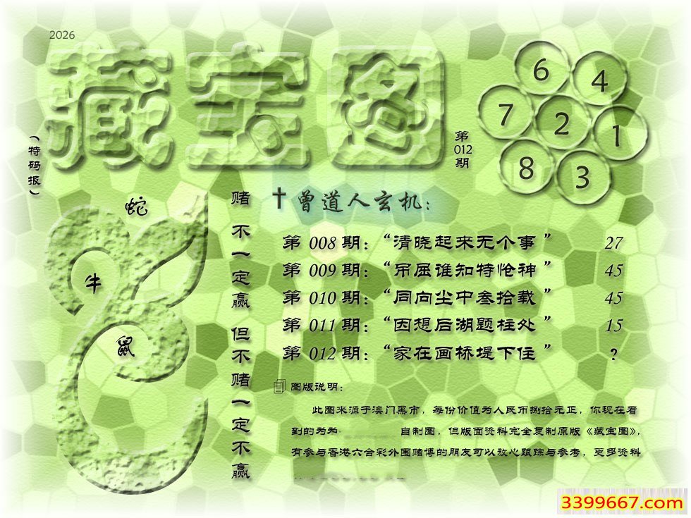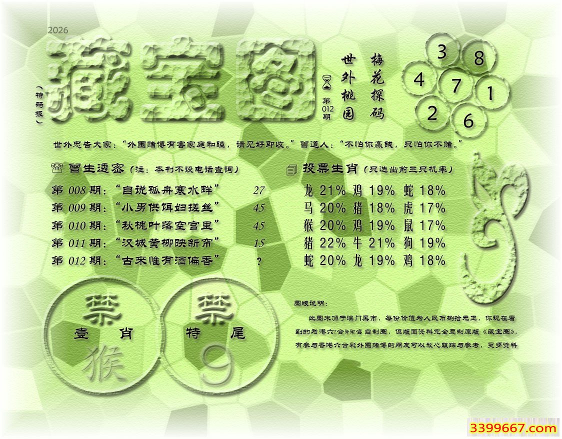 | 主题 :012期藏寶圖 新:家在画桥堤下住 老:古来帷有酒偏香 禁:猴 禁:9尾 |