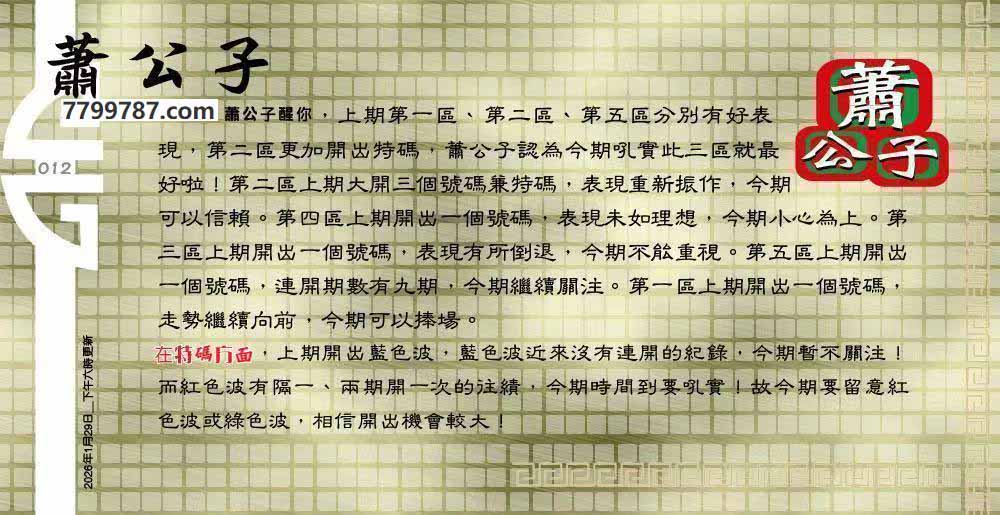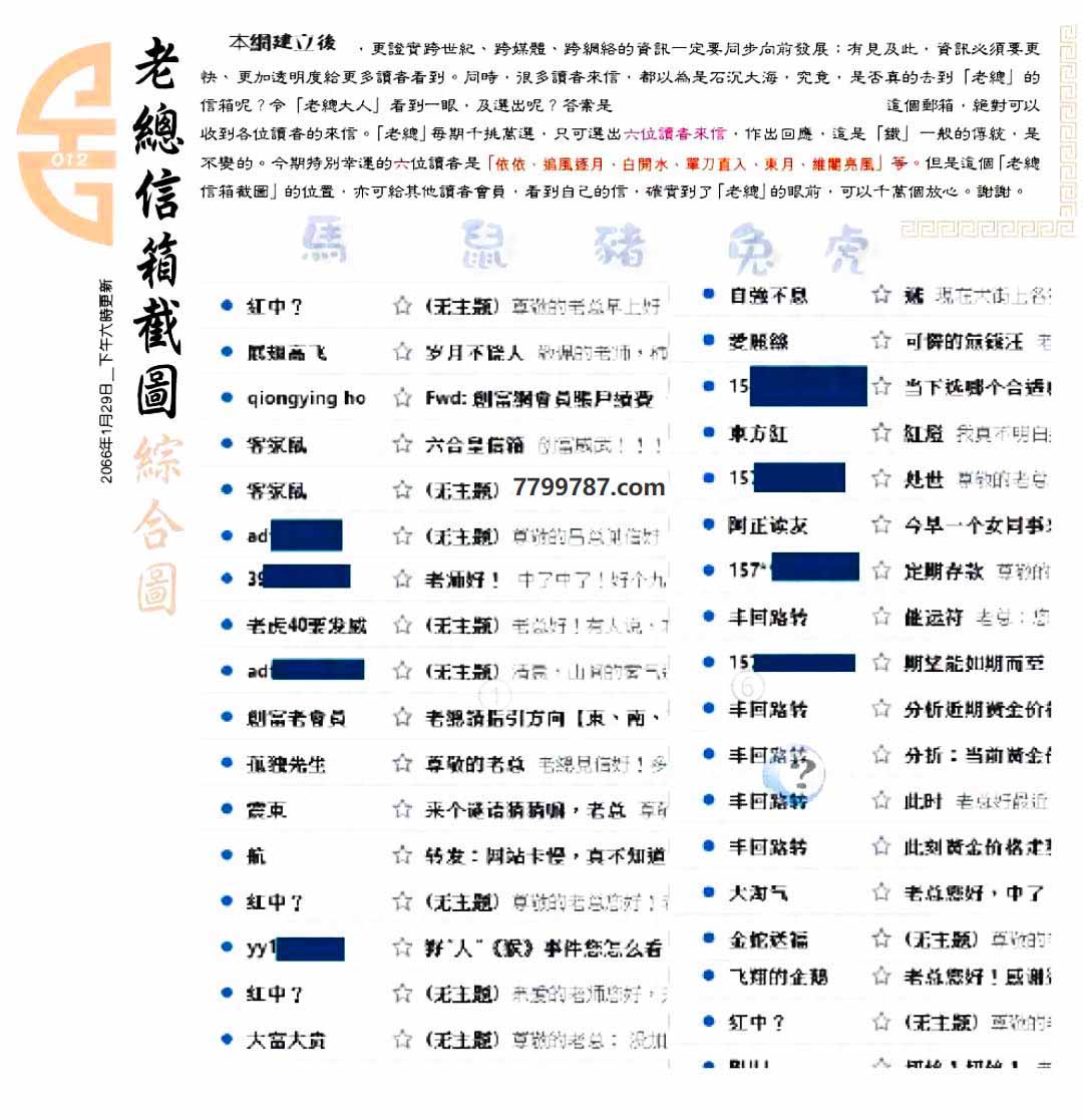 | 主题 :012期:六合皇金句/老总论码/萧公子/林大师/五行夺码/老总信箱截 |