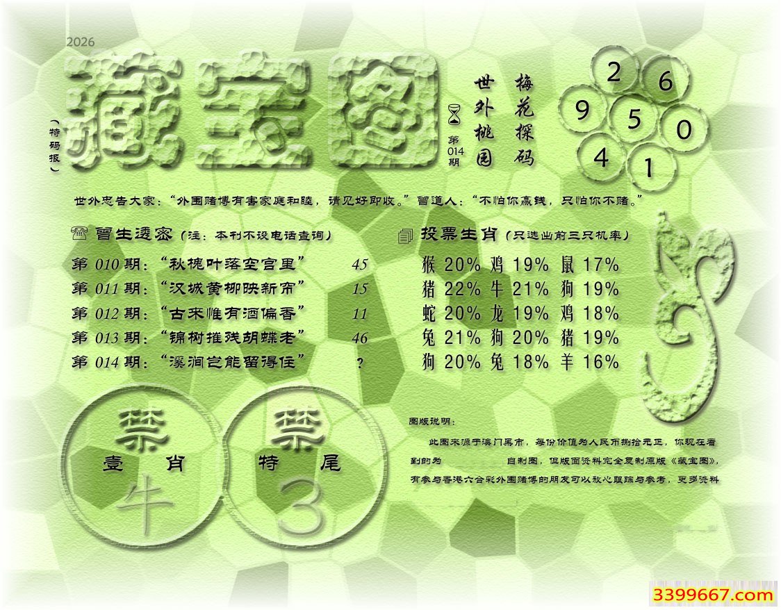 | 主题 :014期藏寶圖 新:但觉山光侵酒绿 老:溪涧岂能留得住 禁:牛 禁:3尾 |