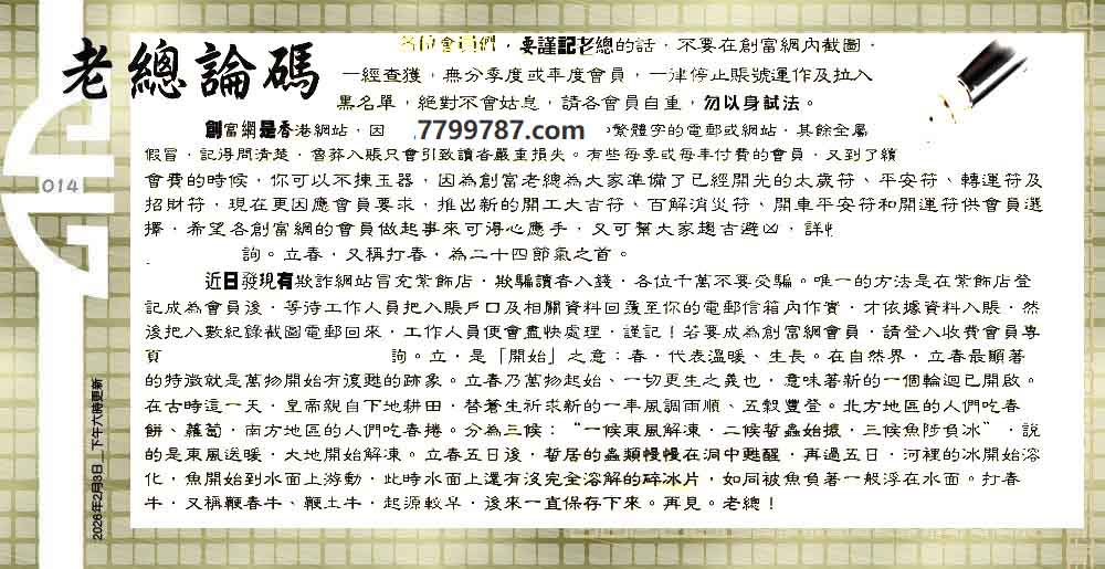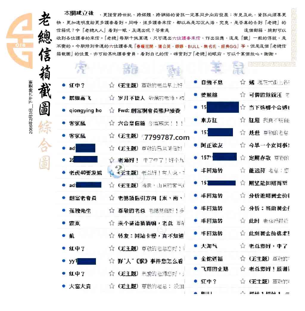 | 主题 :014期:六合皇金句/老总论码/萧公子/林大师/五行夺码/老总信箱截 |