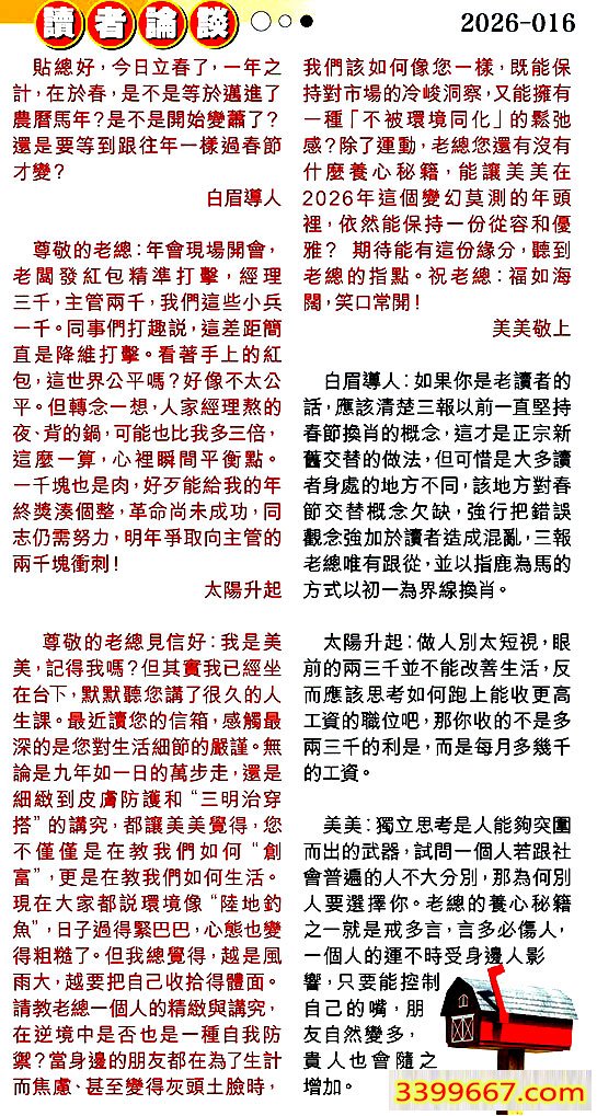 3.尊敬的老總見信好:我是美美,記得我嗎?但其實我已經坐在台下,默默聽您講了很久的人生課。最近讀您的信箱,感觸最深的是您對生活細節的嚴謹。無論是九年如一日的萬步走,還是細緻到皮膚防護和“三明治穿搭”的講究,都讓美美覺得,您不僅僅是在教我們如何“創富”,更是在教我們如何生活。現在大家都説環境像“陸地釣魚”,日子過得緊巴巴,心態也變得粗糙了。但我總覺得,越是風雨大,越要把自己收拾得體面。請教老總一個人的精與講究,在逆境中是否也是一種自我防禦?當身邊的朋友都在為了生計而焦慮、甚至變得灰頭土臉時,我們該如何像您一樣,既能保持對市場的冷峻洞察,又能擁有一種「不被環境同化」的鬆弛感?除了運動,老總您還有沒有什麼養心秘籍,能讓美美在2026年這個變幻莫測的年頭裡,依然能保持一份從容和優雅?期待能有這份緣分,聽到老總的指點。祝老總:福如海闊,笑口常開!====美美敬上