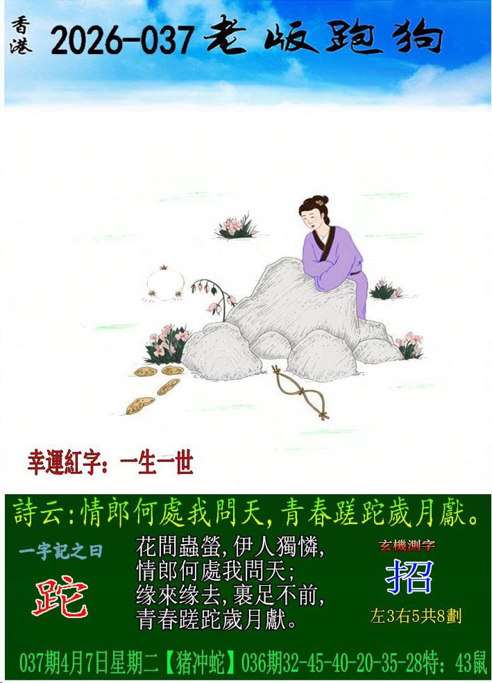 037期老版跑狗一字記之曰:【跎】 玄機測字:《招》